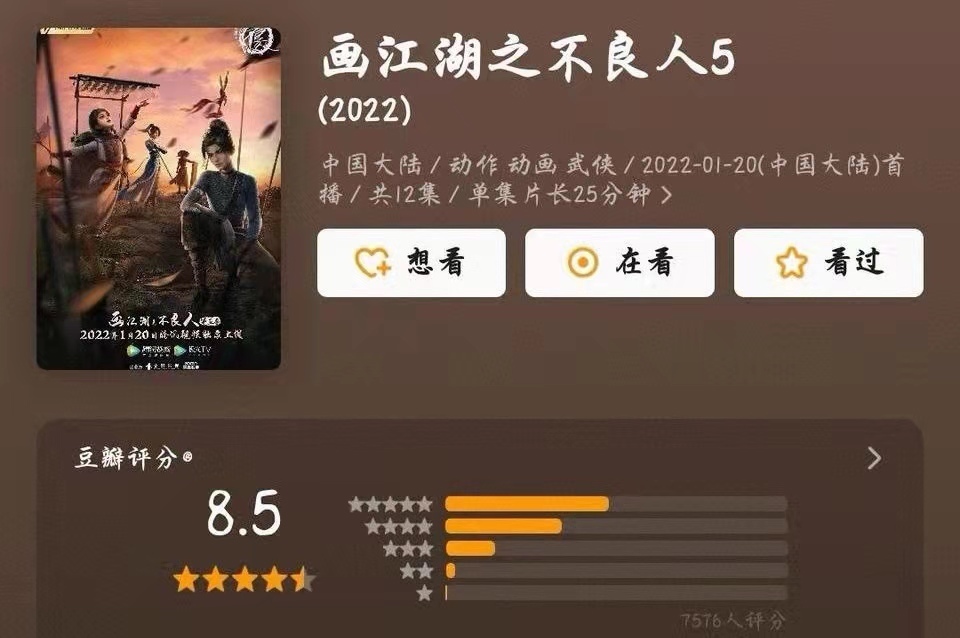 《画江湖之不良人》第五季现在已经官宣完结了,豆瓣关于这一季的评分也终于出来了,给出的评分是8.5,其实在我个人看来,这个评分多少有些低了,我个人觉得这部作品第五季多少都该有9分的。