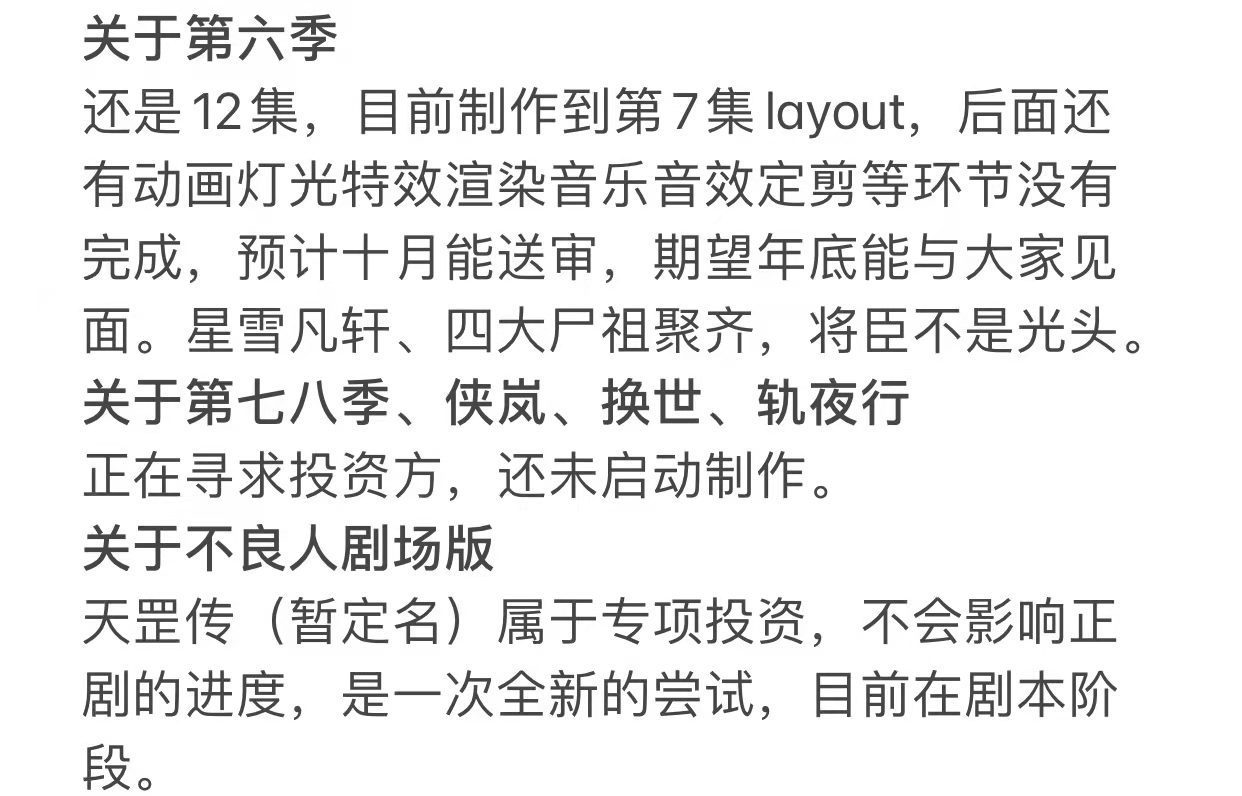 然后则是关于接下来的不良人第七八季以及《画江湖之侠岚》同尘篇以及《画江湖之换世门生》第三季和《画江湖之轨夜行》,他们正在寻求投资方,还没有正式启动制作。也就是说,这些作品只有剧本,一集都还没有正式去做,那恐怕这些作品想要出来要等到后年了。