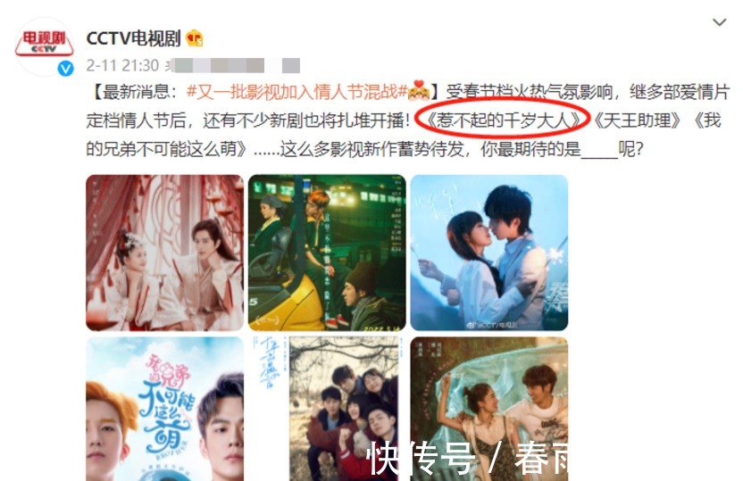 而这些作品,同样得到了央视的注意。近日,电视剧《惹不起的千岁大人》被央视官方账号强势宣传,虽然这部剧在演员阵容上并没有太高的人气。但是从题材设定到男女主的颜值,《惹不起的千岁大人》都是一部值得关注的情人节佳作。