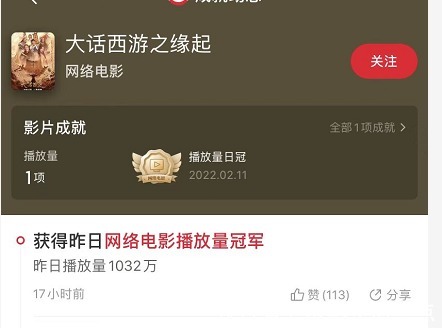 2022年2月11日,由吴昊宸、马心瑞、吴孟达共同主演的奇幻喜剧爱情片《大话西游之缘起》正式上线,这也是达叔时隔27年后再演《大话西游》。上线前,本以为这又是一部蹭ip的烂片,但看完了才发现这是一部诚意满满的优秀续作。上线当天,即拿下当日网络电影播放量第一,播放量破1000万。