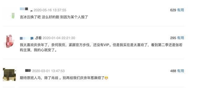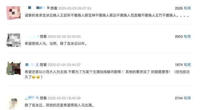 电视剧还未播出,豆瓣下的短评就有三千多条,其中大部分都是一个意思:希望全剧除了言冰云,其他都是原班人马。甚至有人表示,如果言冰云没有换,就打1星。