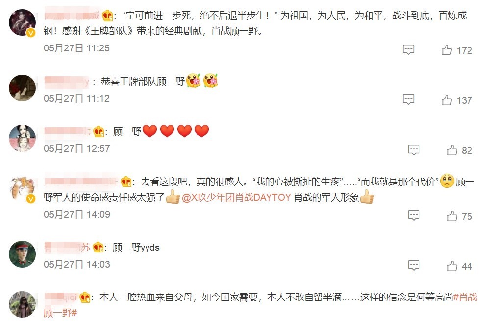 而看到这样的成绩很多网友们都非常地兴奋,不自觉得想起了剧中的台词:“宁可前进一步死,绝不后退半步生!” 为祖国,为人民,为和平,战斗到底,百炼成钢!感谢《王牌部队》带来的经典剧献,肖战顾一野。