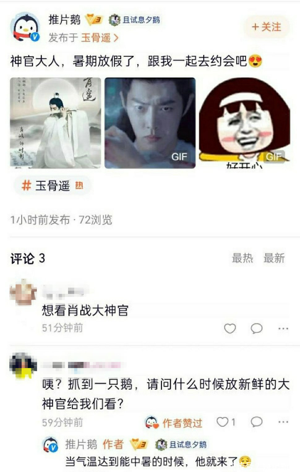 近日,有网友在网上提问什么时候放新鲜的大神官给我们看?而推片鹅则是回应称:当气温达到能中暑的时候,他就来了。于是很多网友们就表演起了“在线中暑”,希望能够看一下时影大神官解解暑。