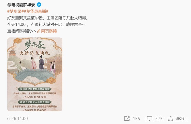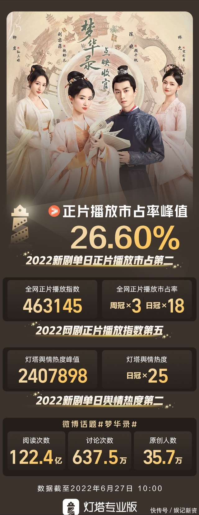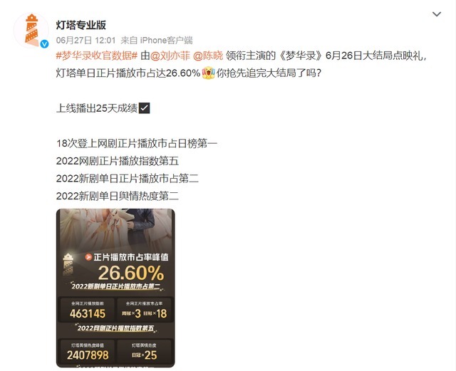 而大结局点映礼之后专业数据网站也晒出了《梦华录》的收官数据。灯塔专业版27日发文称由刘亦菲、陈晓领衔主演的《梦华录》6月26日大结局点映礼灯塔单日正片播放市占达到了惊人的26.60%。