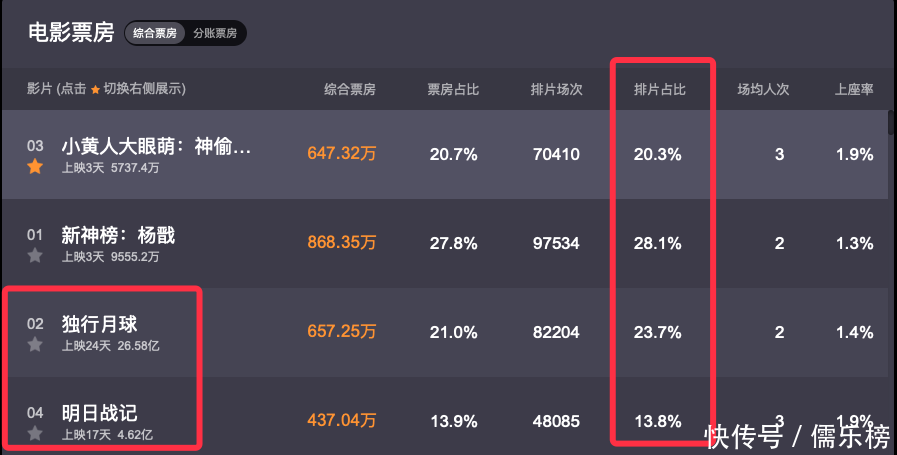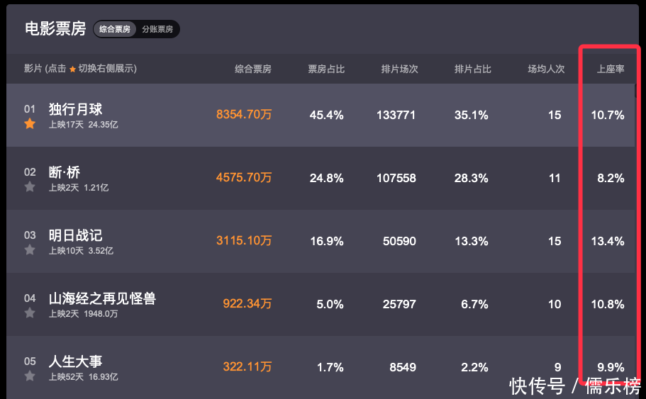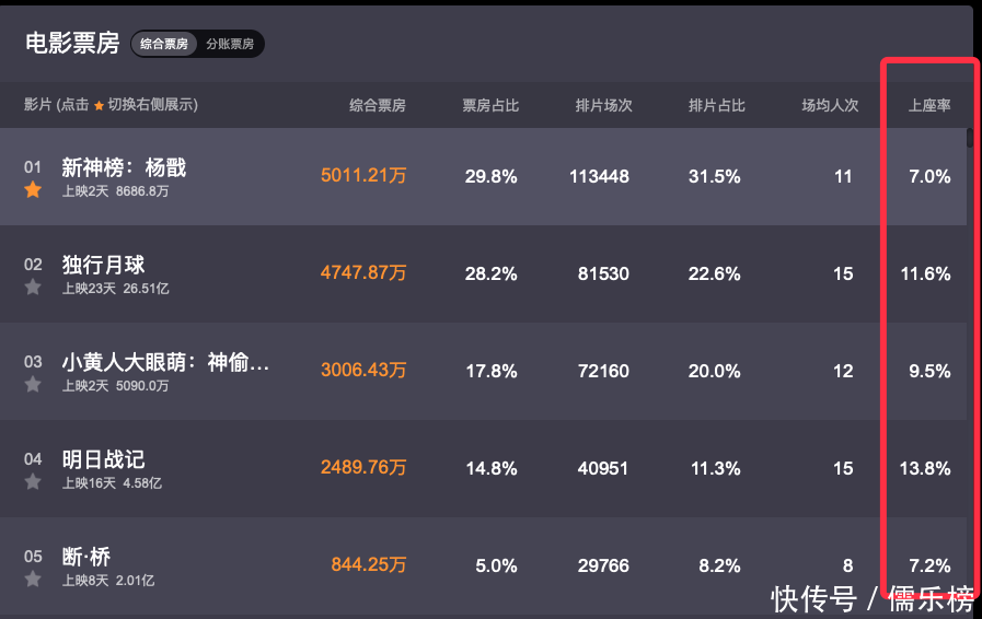 上座率,即上座人数与总座位数的比值。从某种意义上来说,优秀的影片上座率就高,反之则低,因而上座率又是衡量一部影片质量优劣的重要标准之一!一般来说,上座率高的电影应该得到更多的排片,因为这是众多网友「投票」的结果,可现实却与儒爷想象的完全不同。