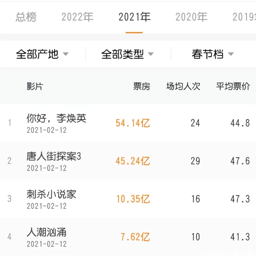 早前由刘德华主演的《人潮汹涌》口碑力压《唐人街探案3》和《你好李焕英》,但票房却不及两者的零头,上映10天时春节假期结束时,《唐探3》《李焕英》早已突破40亿票房,但《人潮汹涌》却只拿下了3亿票房。最后,凭借刘德华的大力宣传,以及各位网友的支持,该片最终拿下了7.62亿的票房。