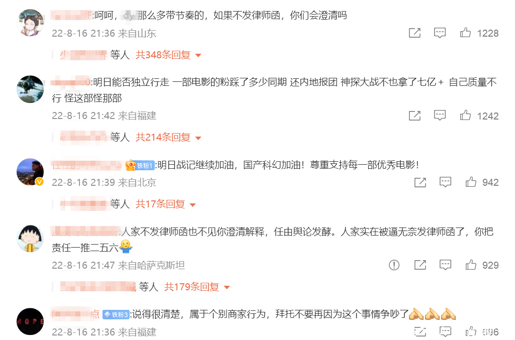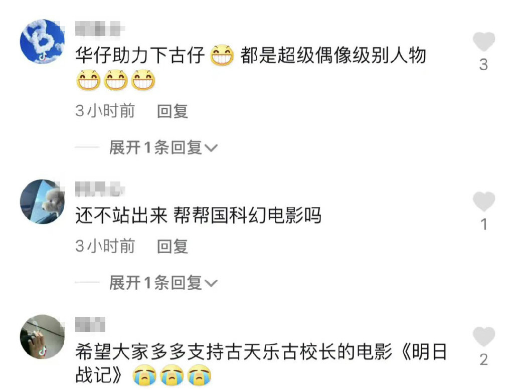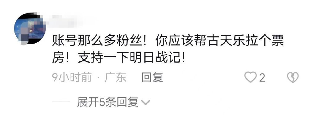 一些语气好的还询问能不能帮古天乐宣传一下新电影,有一些语气不好的直接反问称:还不站出来帮帮国产科幻电影吗?更有一些网友觉得理所当然,表示账号这么多粉丝,你应该帮古天乐拉一些票房,支持《明日战记》。