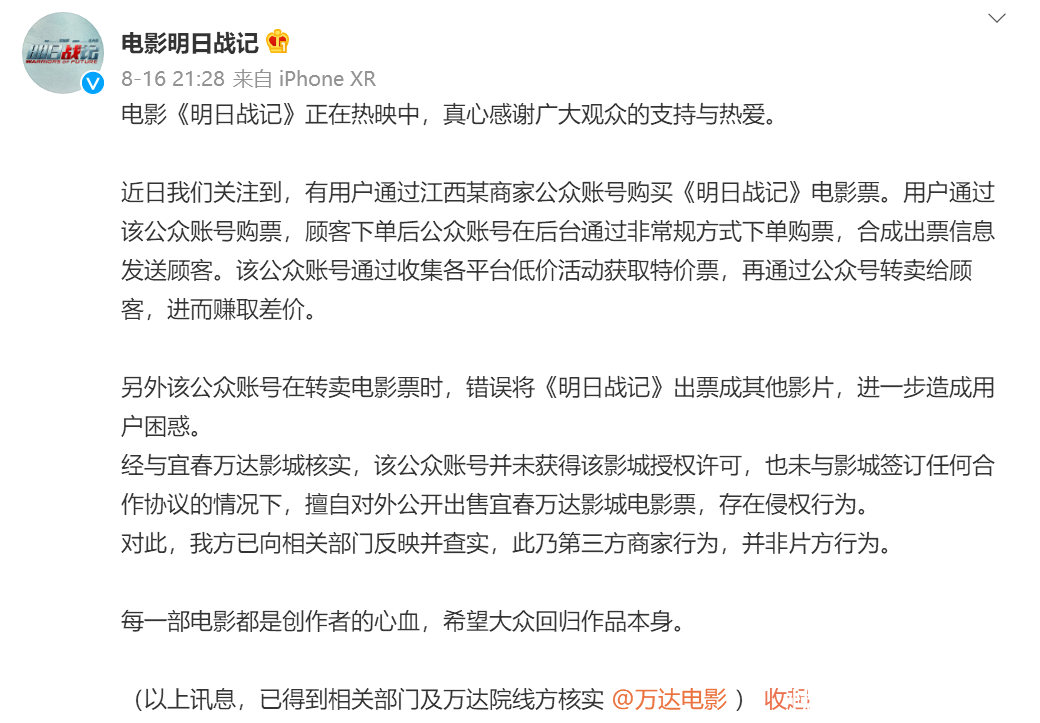 随后《明日战记》官方微博也发文对此事进行了声明,原来是有公众账号利用活动狗迷特价票再卖给顾客,但是转卖时出票错误,造成问题。乃是第三方商家行为,并非片方行为。