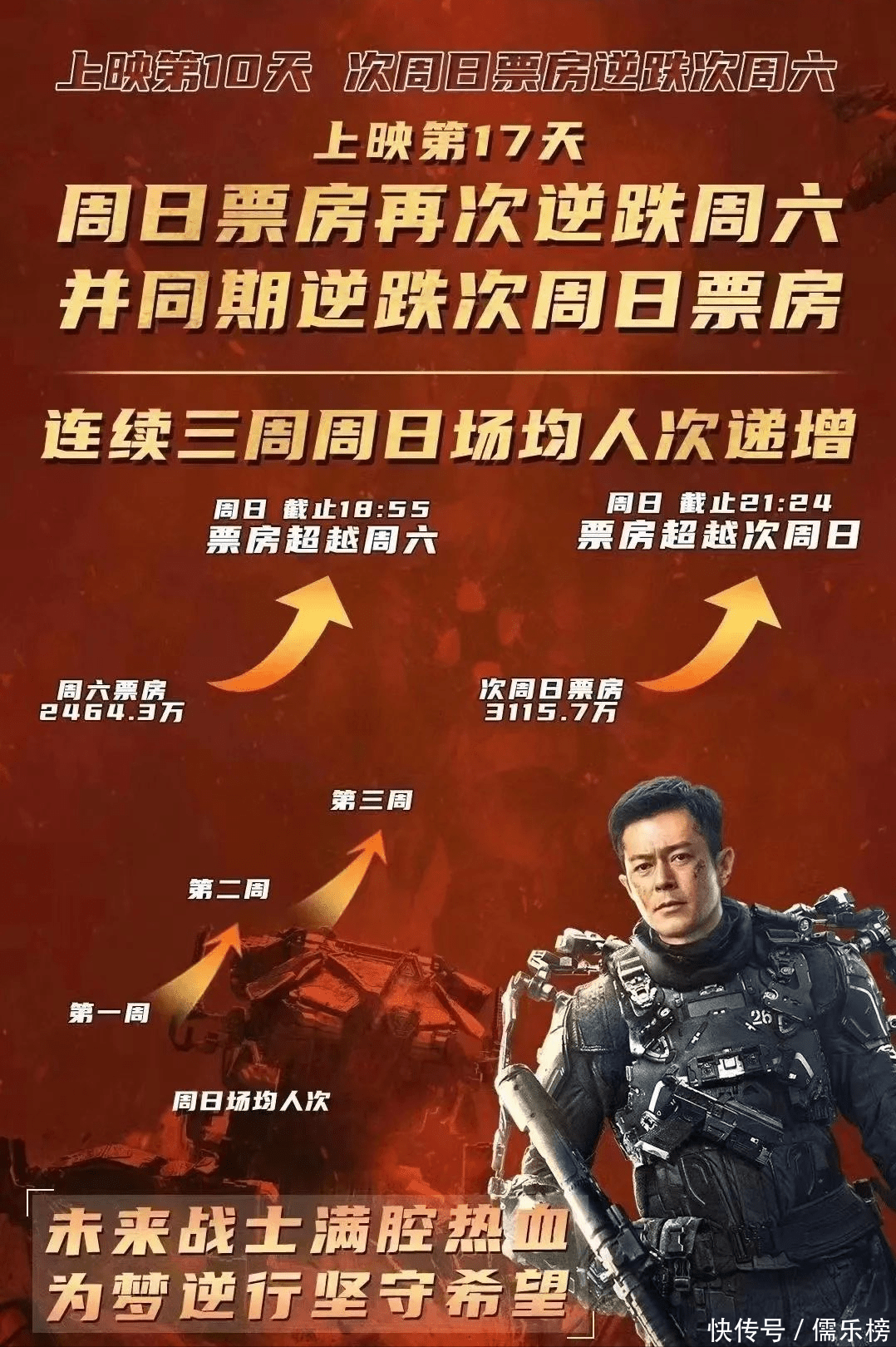 正常情况下,一部电影上映后,日票房、上座率、观影人数都会逐渐减少,甚至在上映后的一周内,影片数据会断层下跌, 因为观众的热情逐渐消失。但是,也有例外。 就儒爷今天说的这部电影——香港影帝古天乐主演的华语首部机甲科幻电影《明日战记》!