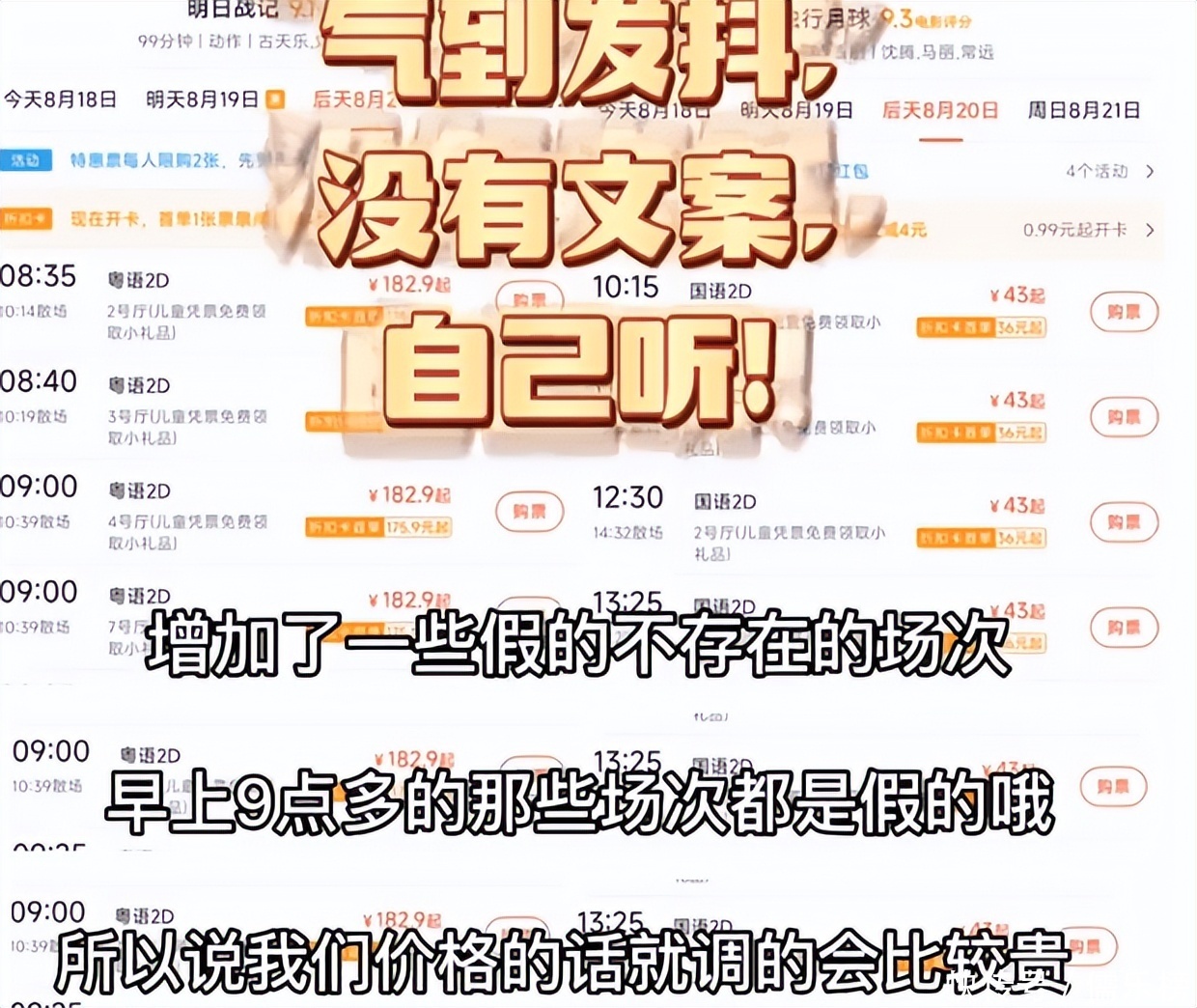 原来事情并非大家所想的那样子,据这网友透露,原来《明日战记》这些在10点之前的场次全都是假的,院线之所以安排这些场次,是因为《明日战记》片方要求增加排片,他们这样做只是为了完成「任务」。所以,才特意标这么高的价格,以避免观众去购买。但如果真有网友去买的话,院线也会安排退票。