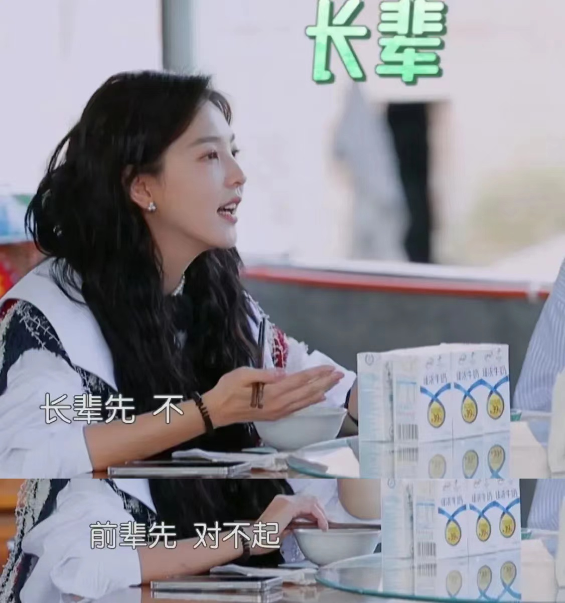 事情是这样的,吃饭的时候,章若楠想客气地让黄晓明先吃,于是嘴瓢说成了:“长辈先吃,不是,前辈先吃,对不起。”