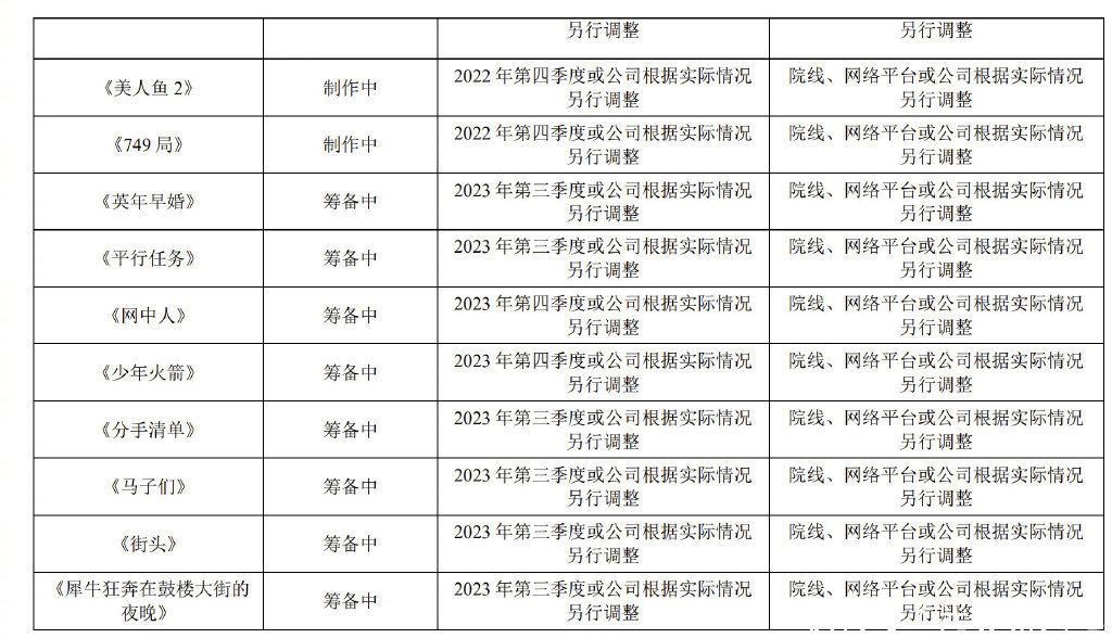 此外表格中还给出了电影《749局》的计划,也是在今年第四季度上映,此外还有《英年早婚》《平行任务》《网中人》等作品,都还在筹备中,希望能早日和观众见面。