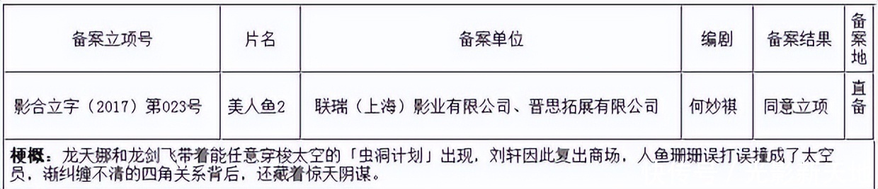 《美人鱼》票房大卖之后,2017年《美人鱼2》就立项了,从当时的立项通知来看,备案单位为联瑞影业,编剧是何妙祺,剧情梗概延续上一部,但也更加天马行空,龙天娜和龙剑飞带着能任意穿梭太空的“虫洞计划”出现,刘轩因此复出商场,人鱼珊珊误打误撞成了太空员,渐纠缠不清的四角关系背后,还藏着惊天阴谋。