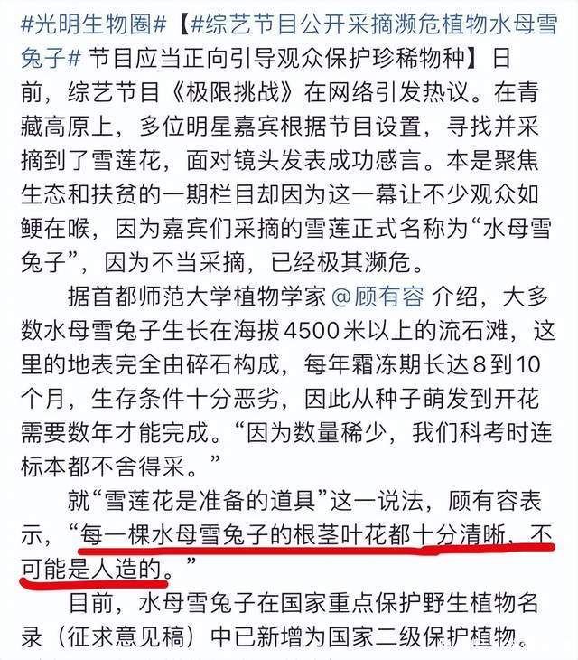 ——2020年《极限挑战宝藏行》节目组竟然安排嘉宾去采摘雪莲,相关部门直接介入调查。