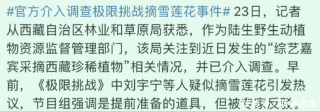 一开始嘉宾刘宇宁和节目组还先后发布澄清,表示采摘的是道具雪莲,结果被专家公开打脸。
