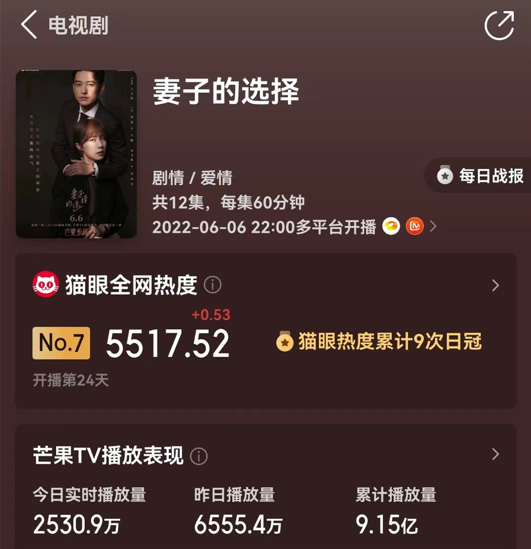 影视市场也相继推出多部以婚姻问题为核心的影视剧,刚好就在近期一部颇受大家关注的婚姻感情剧——《妻子的选择》创下单平台播放近十亿的不俗成绩。